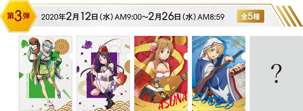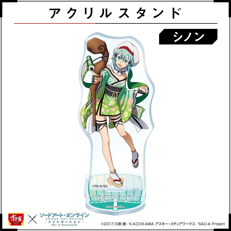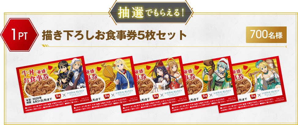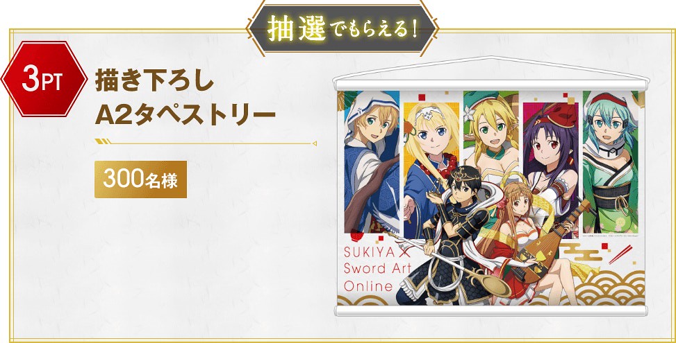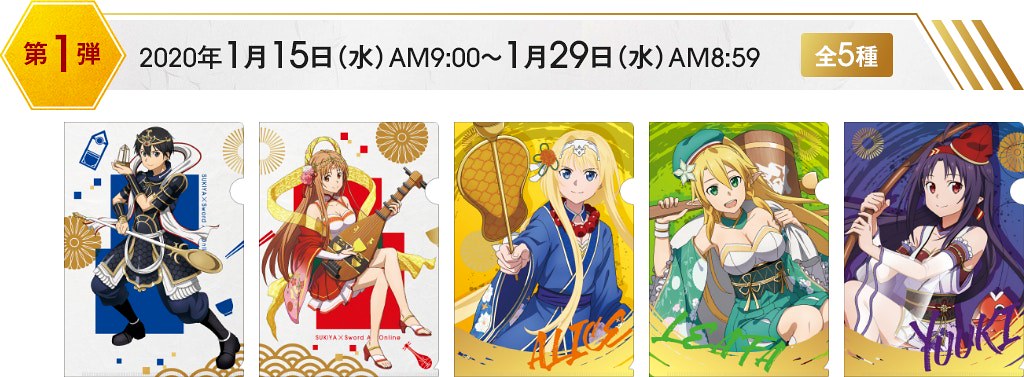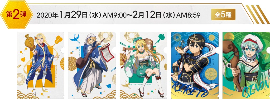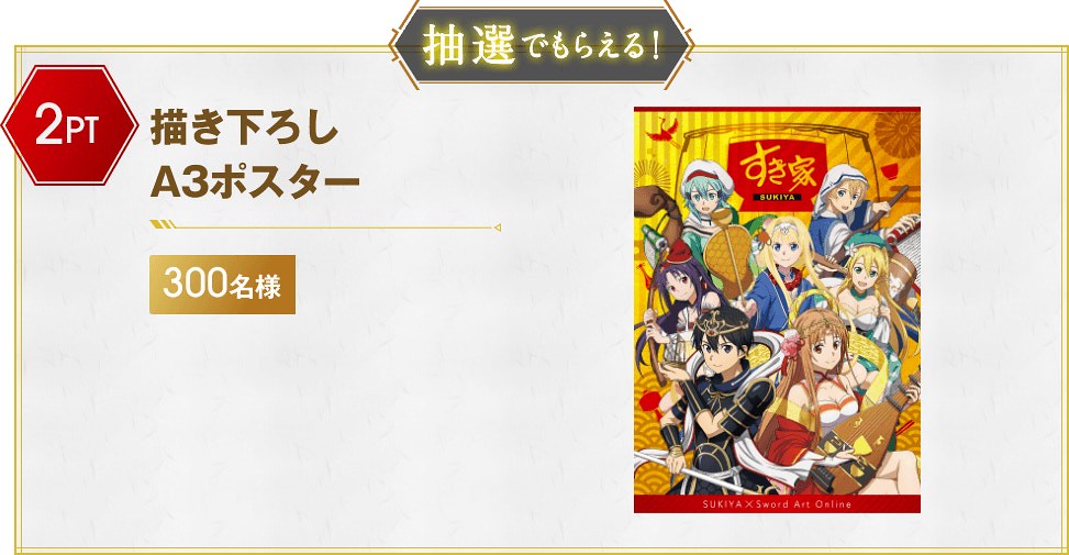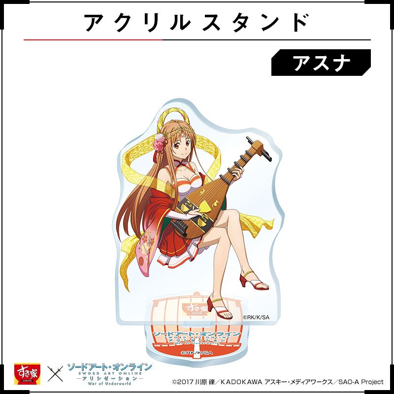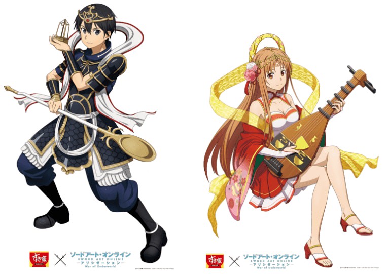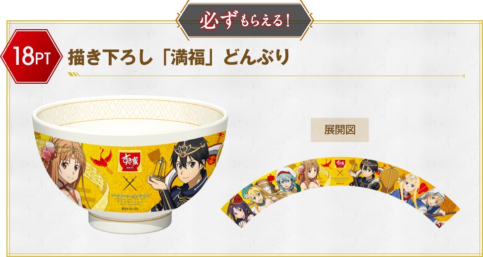在這次與Sukiya すき家的合作中,《刀劍神域 SAO》的角色們:桐人、亞絲娜、愛麗絲、尤吉歐、詩乃、莉法、絕劍有紀,紛紛換上在日本信仰中被認為會帶來福氣、財運的惠比壽、大黑天、毘沙門天、壽老人、福祿壽、辯才天、布袋七尊神明裝扮,推出資料夾、壓克力牌、海報與牛丼碗等聯名活動周邊贈品。