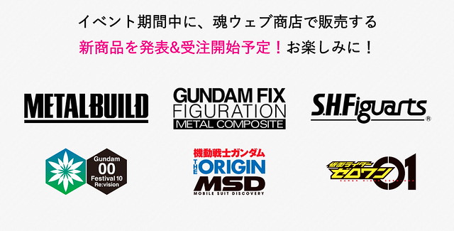 在活動期間,日本魂 web 商店也將同步發表&開放多款新商品預購,包含《機動戰士鋼彈00》十週年企畫 METAL BUILD 新作、《機動戰士鋼彈 THE ORIGIN MSD》GUNDAM FIX FIGURATION METAL COMPOSITE 新作、《假面騎士 ZERO-ONE》S.H.Figuarts 新作。