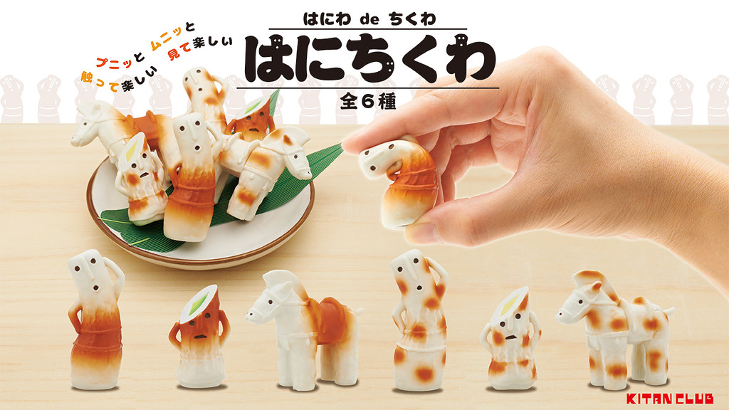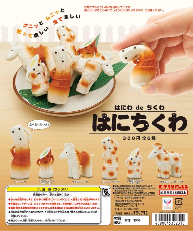 日本轉蛋廠牌奇譚俱樂部(キタンクラブ)將推出趣味的轉蛋新作-日本代表性遺物「土偶」與日本傳統食品「竹輪」結合而成的「土偶竹輪」(暫譯,はにちくわ),除了變成土偶造型,連摸起來也是軟 Q 軟 Q 的觸感,一共有6種款式,一轉參考售價為 300 日幣,預計將在 2020 年 1 月 18 日發售。