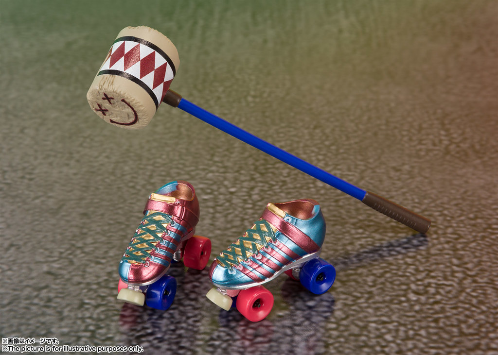 「S.H.Figuarts 哈莉·奎茵 (BIRDS OF PREY)」高約 14.5 公分,根據已經在預告裡登場,金色吊帶連身衣搭配粉紅色小可愛的造型製作,雙馬尾明顯要比《自殺突擊隊》版本的哈莉·奎茵短得多,瀏海的凌亂度更可以用放蕩不羈來形容XD~右手腕的刺青高度再現,服裝的拉鍊細節也沒放過,頭雕共有大笑、露齒笑、含著棒棒糖三種,配件部分附上招牌的大槌、棒棒糖、多個替換手,值得一提的是復古溜冰鞋施以精美的刻畫與塗裝,色澤表現相當亮眼!