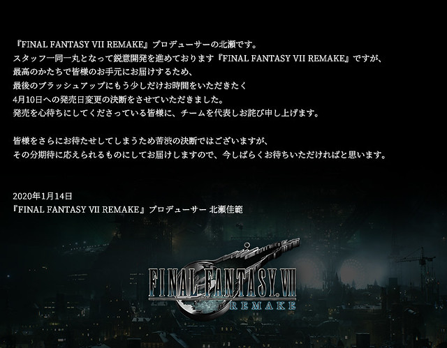 《FINAL FANTASY VII 重製版》製作人北瀨佳範表示,為了讓遊戲能以最佳品質送至玩家手中,需要花費更多時間進行最終調整,因此決定將發售日期調整至 2020 年 04 月 10 日,在此為費心等待的玩家們致上歉意,相對地團隊推出的作品將不會辜負各位的期待,敬請耐心等候。