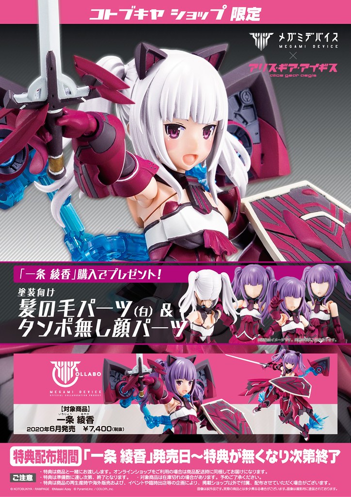 由日本壽屋玩具公司(KOTOBUKIYA)發行,結合機械與美少女的組裝模型系列『女神裝置(メガミデバイス)』繼吾妻楓、兼志谷星、吾妻楓【皆伝】、相河愛花後,今(16)日再度發表了與人氣手機遊戲《機戰少女Alice》合作的最新商品「女神裝置 一条綾香」預計於 2020 年 06 月發售的消息。