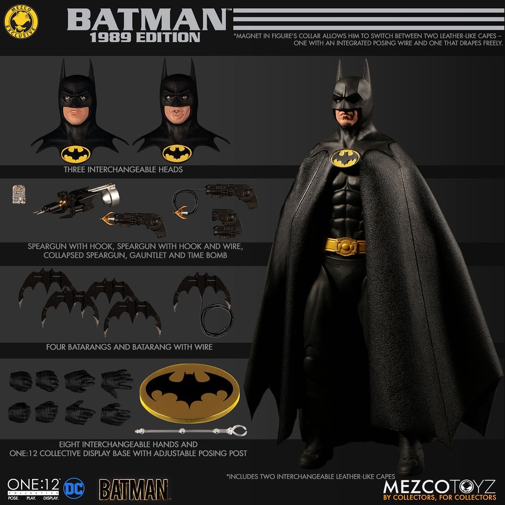 「《蝙蝠俠》1989年版」的蝙蝠俠,全高約 17 公分,使用全新的無縫機身,身穿電影中的標誌性的蝙蝠裝,並有三種頭雕,除了可動眼睛增添真實感,也還原米高基頓的招牌嘟嘟嘴。