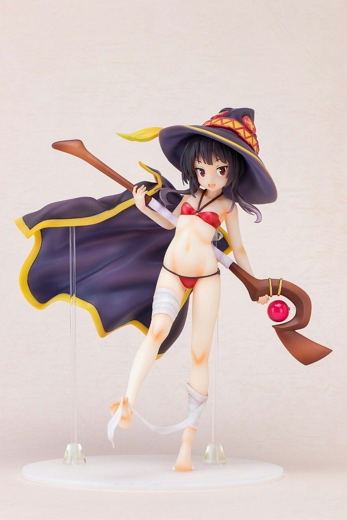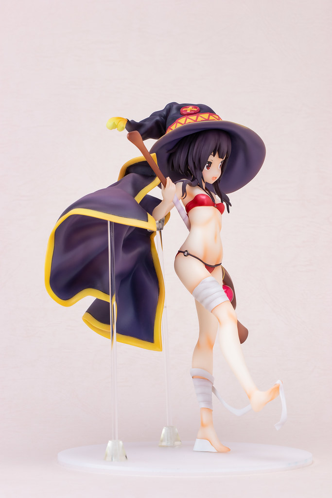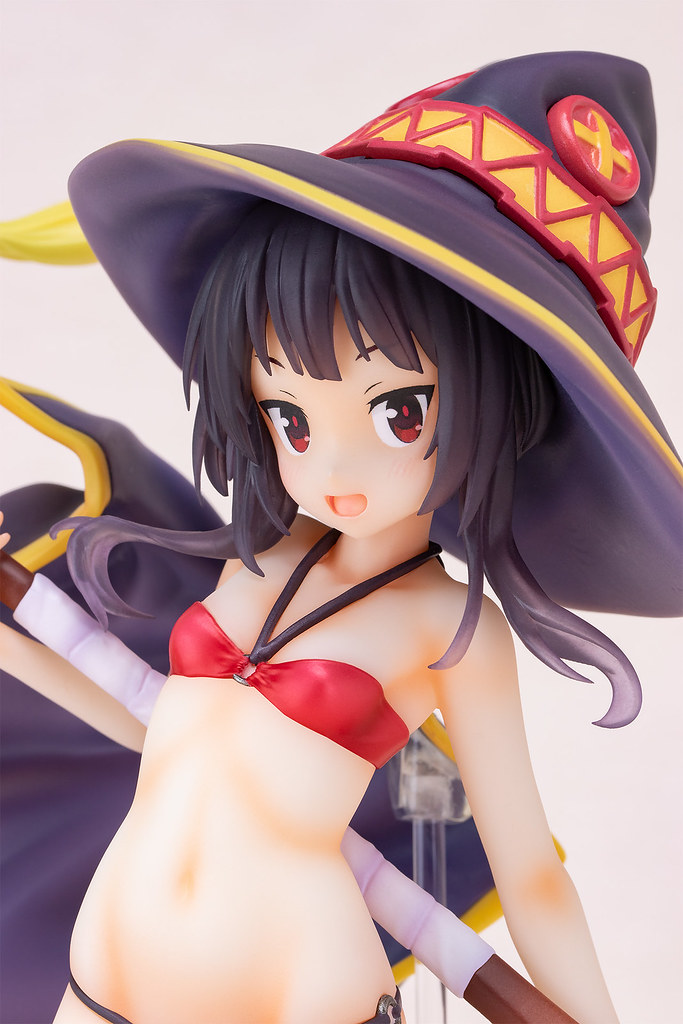 「惠惠 泳裝Ver. 」1/7比例塗裝完成品,是依照《為美好的世界獻上祝福!紅傳說》的泳裝插圖為基礎製作,雖然是貧乳,平坦的胸前與小腹卻也充滿蘿莉的魅力!用腳趾鉤著腿部散落的中二繃帶,模樣相當俏皮。大大的魔法帽與斗篷、魔杖,讓整體造型更豐富又可愛。