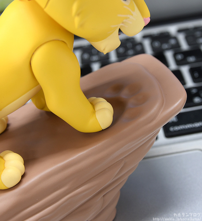 配件則附上能夠重現萬獸之王居高臨下名場景的「榮耀石」,結合底座就能讓辛巴立足在榮耀石上,腳底更有父親木法沙的大腳印。另外還有登場於劇中歌『I Just Can't Wait To Be King』MV,使用布料製作的「葉子鬃毛零件」,能夠固定在辛巴的頸部關節,再現等不及長大的可愛模樣!