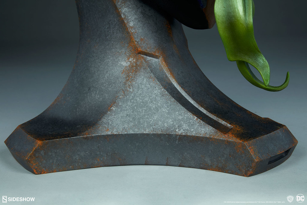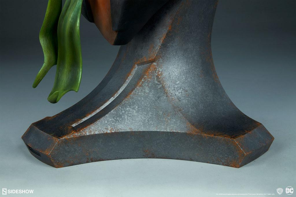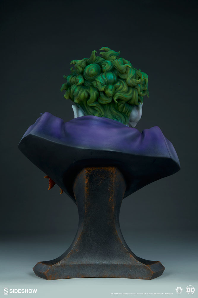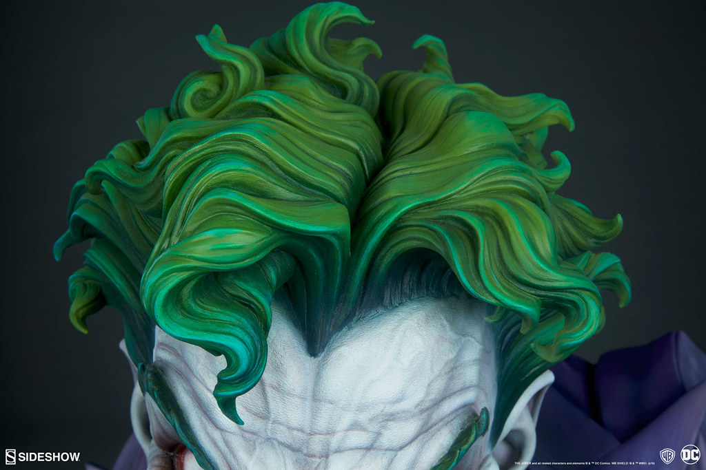 這款由 Sideshow 推出的「小丑 1:1 比例胸像」高約 69.8 公分,採用玻璃纖維、樹脂製作,以出色的技法打造出高譚犯罪王子的瘋狂面貌,雙眼散發出的戲謔感極度傳神,一頭綠色的亂髮呈現出自然的捲度與立體感,消瘦的臉龐、高挺的鼻子、明顯的顴骨、深刻的皺紋,以及佈滿額頭的暴起青筋都讓這尊小丑有著極為強烈的張力,塗歪的口紅、發黃的牙齒也都高度再現。