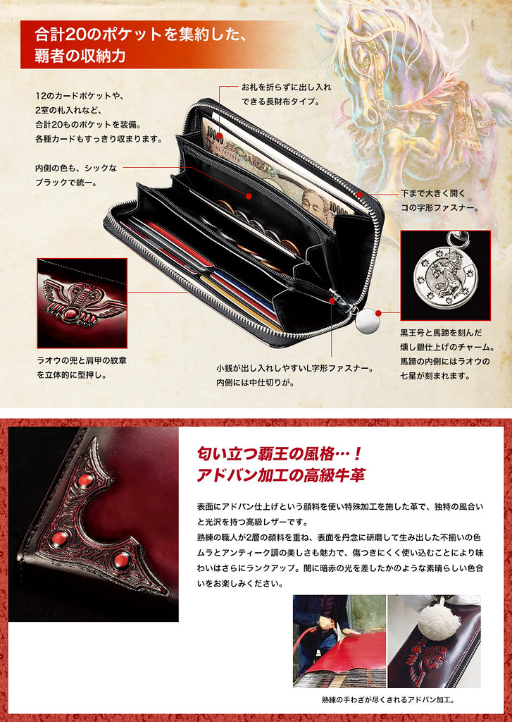 世紀末覇者拳王 拉歐 皮革錢包以充滿魄力、野性的深紅色的高級牛皮革作為主要材質,並將拉歐的頭盔、肩甲紋章融入設計中,呈現歐拉的霸氣與堅牢不可催的氣勢。除了外觀設計,也著重功能性,總共配備 20 個夾層,包括鈔票隔層和 12 個卡片層。拉鍊為招牌坐騎「黑王號」的圖樣裝飾,整體風格帥氣滿點!