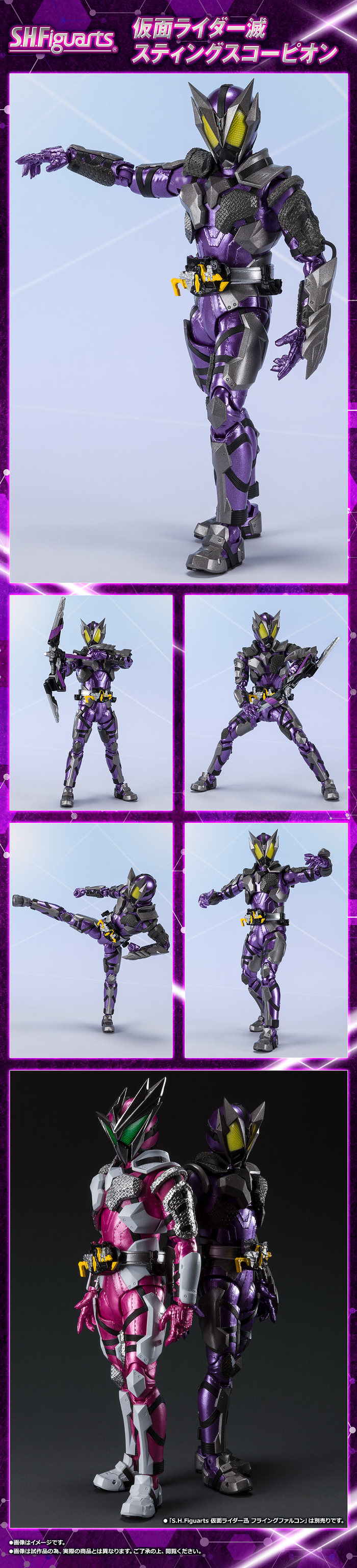 「S.H.Figuarts 假面騎士滅 刺針毒蠍型態」大幅還原劇中形象,不僅製作出複眼內的格紋、鎧甲的鋼板紋路等細節,特徵的頭部造型、左臂伸縮突刺武裝也具備銳利的造型,配合厚重的金屬紫塗裝更加帥氣!而髖關節的可動範圍,也能讓滅抬腿再現令人印象深刻的必殺技「煉獄殲滅.Sting Dystopia」。配件中也附上了劇中使用的武裝「Attache Arrow」可使用。