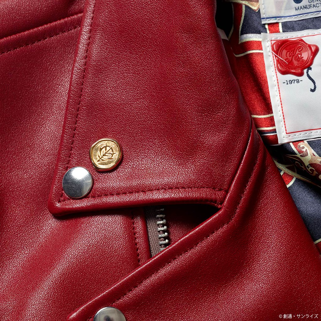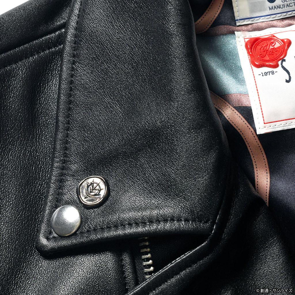 另一款為吉翁軍的樣式(ジオン軍モデル),將國徽融入在袖章及內裡布料中,更有蜂蠟章等精緻點綴。而黑色皮革有別於紅色彗星的高調,易於穿搭,也能展現出對吉翁的熱愛!有興趣的玩具人可以到網站上參考。