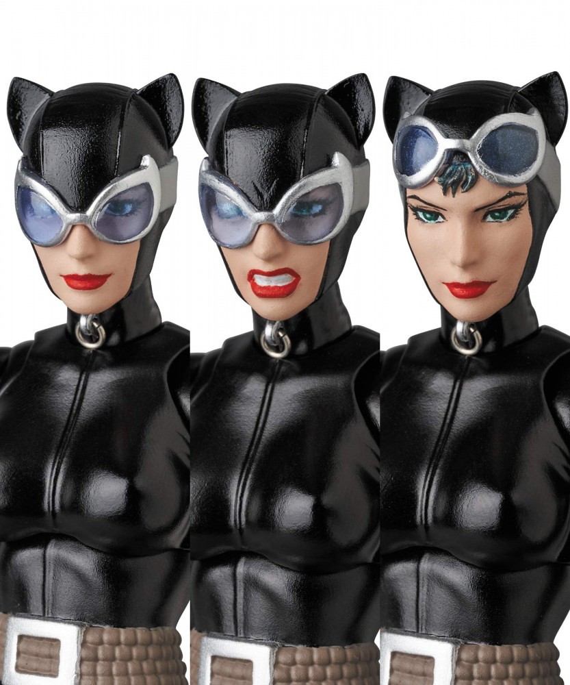 「MAFEX 貓女(緘默版本)」高度再現了 Jim Lee 筆下的貓女魅力,人偶的身形曲線玲瓏有致,豐滿堅挺的上圍與腿部線條尤其性感,包含戴上眼罩的普通、咬牙,以及眼妝細緻、露出一小撮瀏海的頭雕共三個,搭配多種替換手型與招牌武器鞭子,就能展現多種靈活的戰鬥姿態!