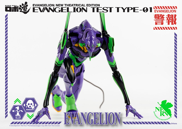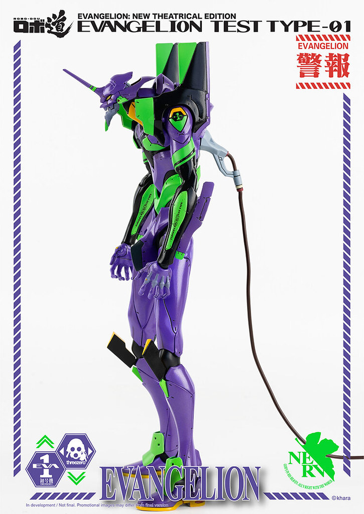 「ROBO道 EVANGELION 初號機」高約 25cm,造型再現 EVA 特色的修長四肢,雙眼與裝甲綠色部份使用蓄光顏料塗裝,可於黑暗中發出迷人夜光、擺設出夜戰場景。骨架部份採用合金材質製作,全身具備 48 處可動部位,可再現經典的起跑、奔跑...等魄力動作。