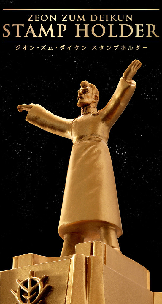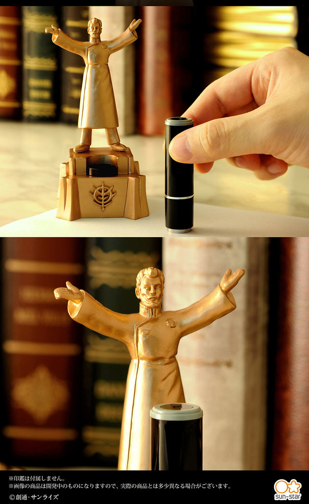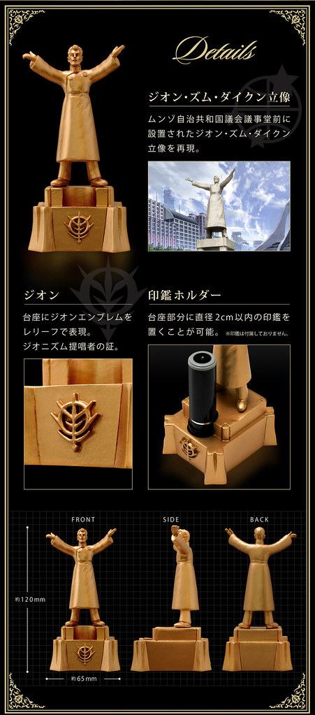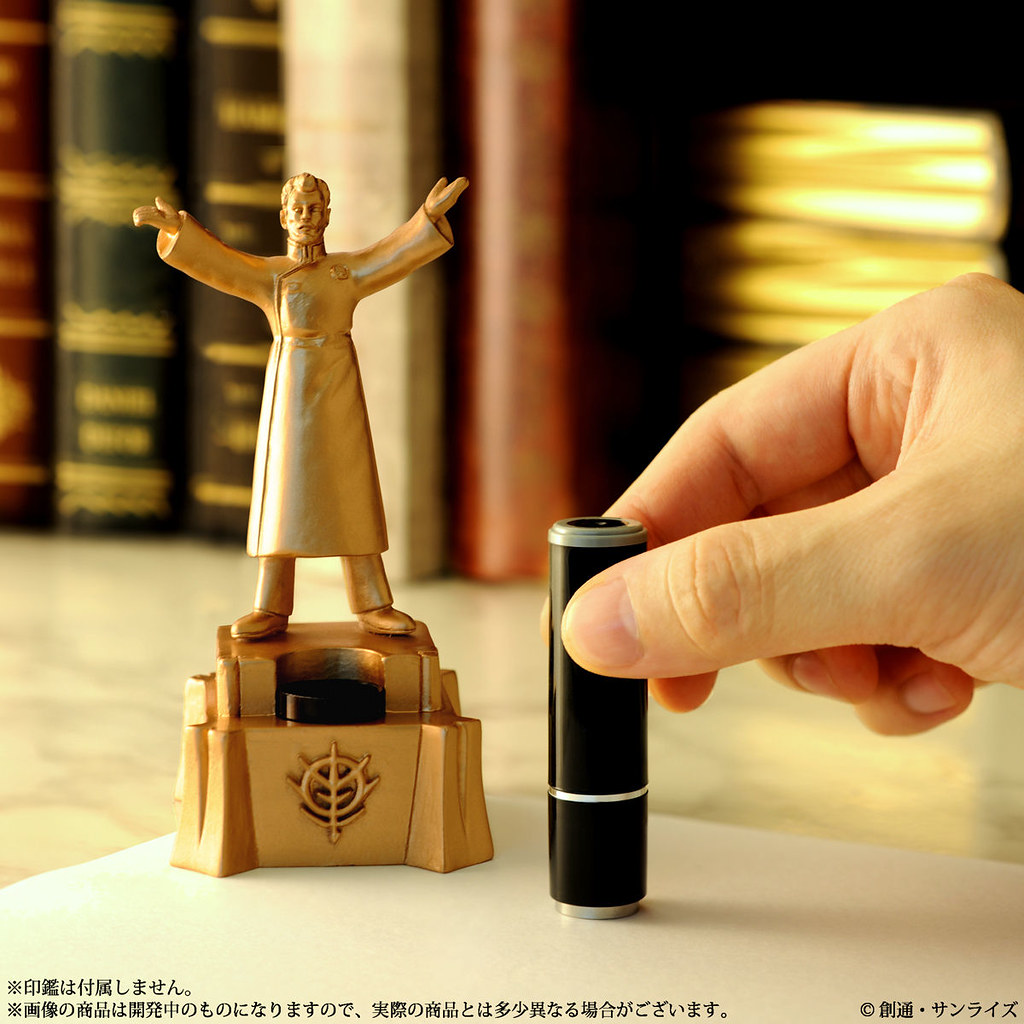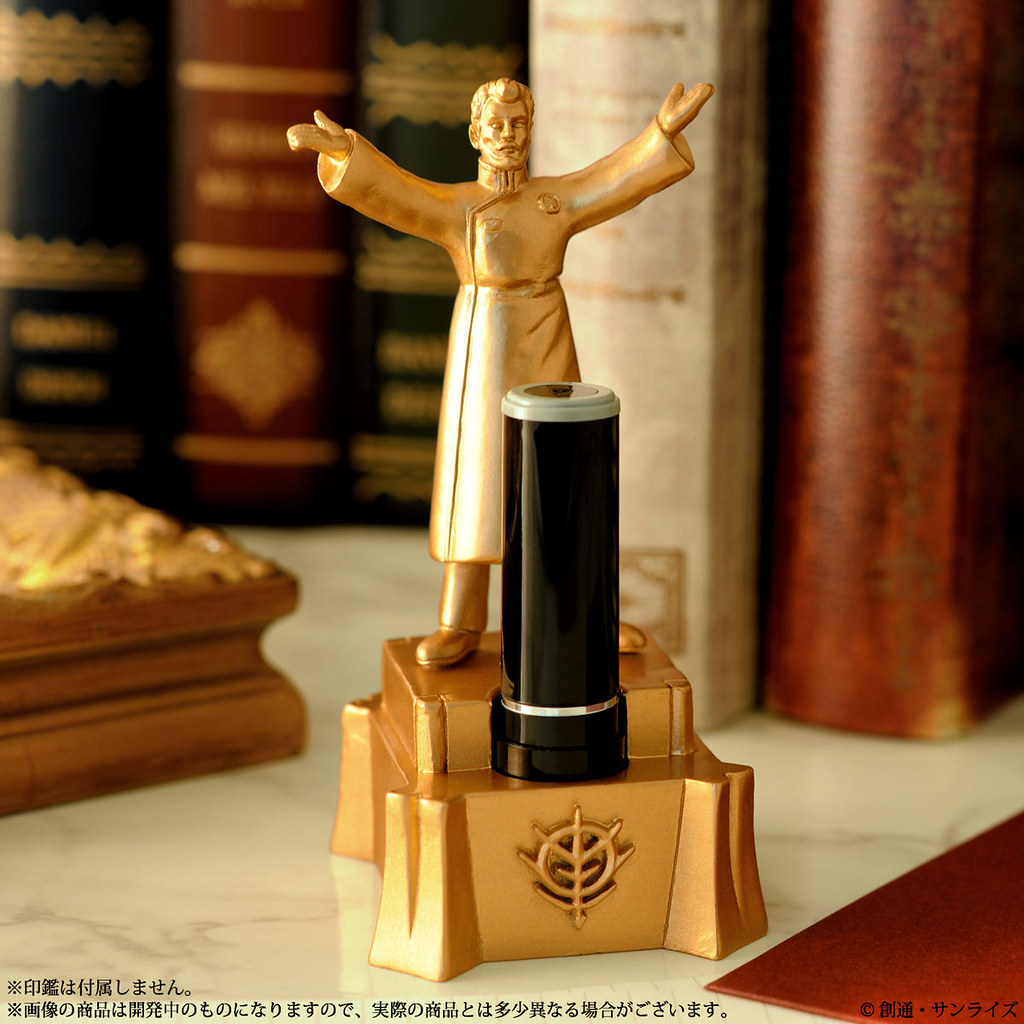 「吉翁.茲姆.戴昆 雕像印鑑架」以吉翁.茲姆.戴昆在慕佐自治共和國國會議事堂前的雕像為設計,重現這位雙手高舉的宇宙世紀最大思想家英姿。整體約為 65 x 120 x 75mm的尺寸,底座可以放置印鑑。擺放在辦公桌、書桌上,除了具有裝飾性,也可供吉翁迷時時膜拜(?)