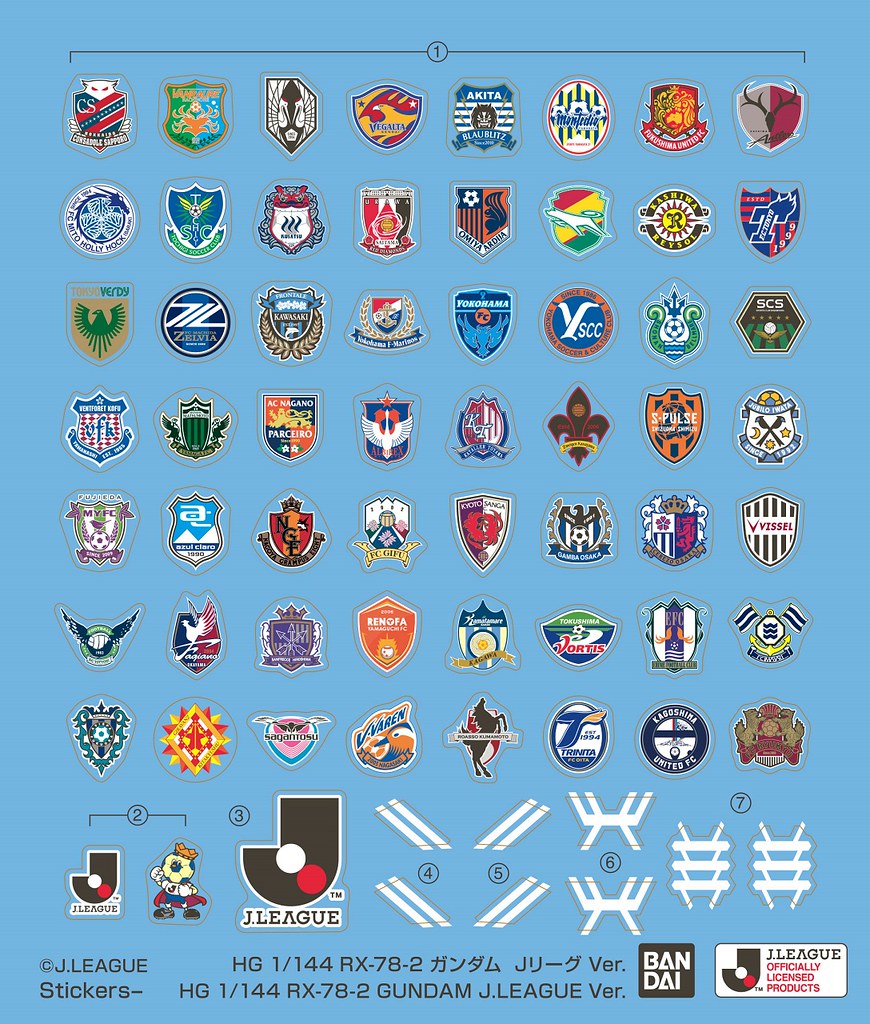 「HG RX-78-2 鋼彈J聯賽Ver.」將 HG 系列 RX-78-2 鋼彈以J聯賽標誌的紅黑配色為主色調,在並隨附J1 ~ J3 的 56 支俱樂部隊徽轉印貼紙,讓球迷可以自由選擇自己支持的隊伍!