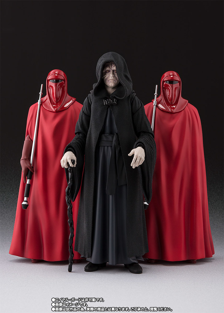 這次的西斯大帝採用如同帝王般的豪華規格推出,包含白卜庭本體、皇帝的專屬王座,以及兩位皇家禁衛軍人偶(不可動),皇帝部分共有一般、露齒兩個頭雕,可以搭配拐杖、兩枚原力閃電配件,以及坐上王座專用的下半身替換零件,把玩出許多老謀深算、居高臨下的場面,而皇家禁衛軍雖然不可動,但右手持握長棍的姿態頗為帥氣,包覆身體的斗篷也製作出起伏的皺褶表現,擺在一起真的氣勢十足!