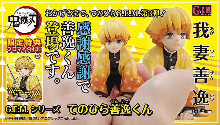 日本 Megahouse 玩具公司旗下將動漫畫角色立體化的高品質模型「G.E.M.」系列,繼推出大人氣動漫《鬼滅之刃》為主題的「掌中的禰豆子醬」、「掌中的伊之助君」後,又將推出第三彈新作:「掌中的善逸君」(てのひら善逸くん),參考售價為日幣 5,800円,預計將於 2020 年 07 月下旬發售。
