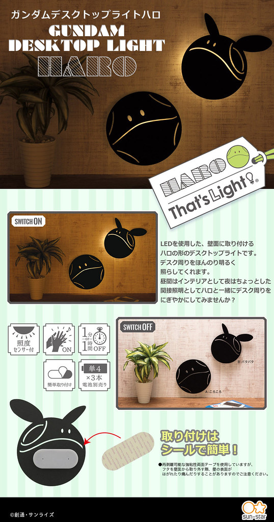 日本SUN-STAR 文具公司(サンスター文具株式会社),將推出以《機動戰士鋼彈》中吉祥物剛球「哈囉(ハロ)」為設計的兩款「哈囉 桌面燈」(デスクトップライト ハロ),參考售價為日幣 3,520元,預計將於 2020 年 04 月發售。