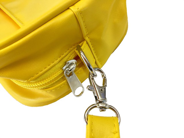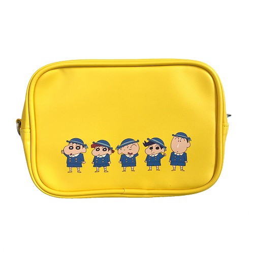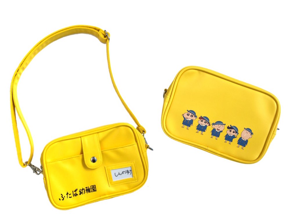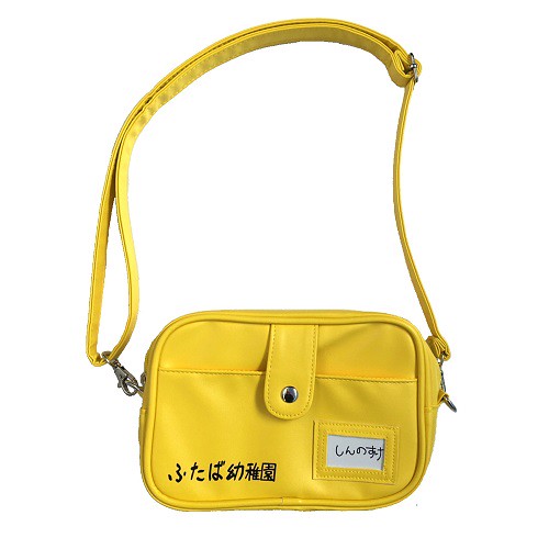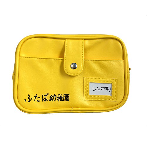 黃色斜背的皮革小書包,造型重現劇中方方黃黃的模樣,正面印有「雙葉幼稚園」的日文字樣,側邊也附上了可以放入姓名小卡的透明姓名欄,完全還原了雙葉幼稚園書包的模樣!背面則是加上了「春日部防衛隊」全體人員:小新、妮妮、正男、風間、阿呆,一字排排站的圖樣,相當可愛!
