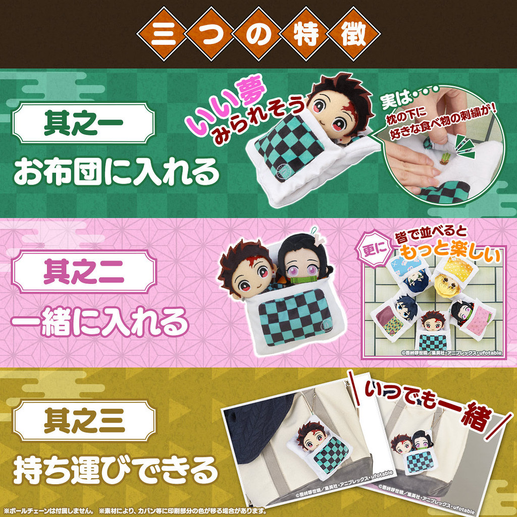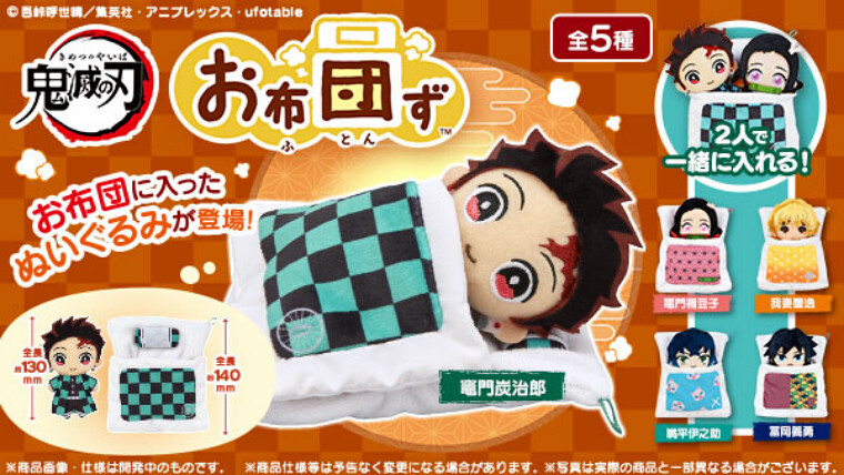 「鬼滅之刃 棉被布偶」小吊飾共有5款,為熟悉的主角群:竈門炭治郎、妹妹竈門禰豆子、我妻善逸、嘴平伊之助與富岡義勇,每款布偶的本體約 130mm,棉被全高約 140mm,最大的特色就是可以將布偶與被窩分離,也可以將兩隻布偶同時擠進同一個被窩唷!