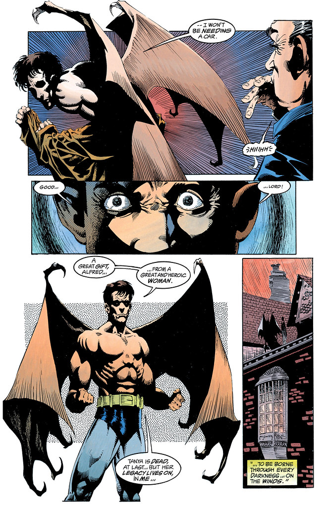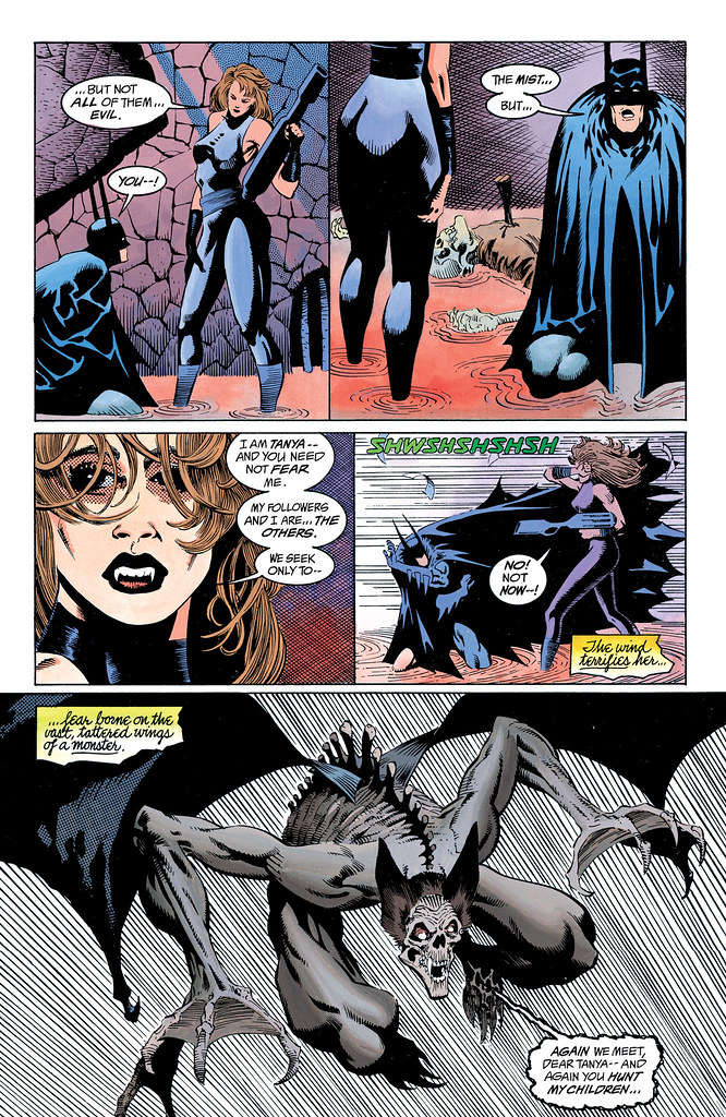吸血鬼蝙蝠俠,來自 Doug Moench 編寫、Kelley Jones 繪畫的漫畫故事《蝙蝠俠與德古拉三部曲(Batman & Dracula trilogy)》,包含 1991 年的 Red Rain、1994 年的 Bloodstorm 與 1998 年的 Crimson Mist;故事敘述高譚市發生大量殘忍的殺人事件,經蝙蝠俠調查之後發現兇手是「吸血鬼德古拉」!在一次與吸血鬼的戰鬥中,蝙蝠俠遇見了一位與德古拉立場相反的女吸血鬼 Tanya,並因為她而獲得吸血鬼的強悍力量,雖然後來蝙蝠俠順利殺死德古拉,但那股嗜血衝動也越來越強......。