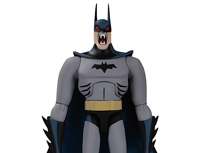 「Batman: The Adventures Continue 吸血鬼蝙蝠俠」高約 17 公分,由 Ty Templeton 設計,採用經典動畫風格重新詮釋這位帶有強烈陰森氛圍、駭人的蝙蝠俠,蝙蝠面罩的耳朵與雙手前臂皆十分細長,雙眼血紅,嘴巴更是直接呈現顯露出尖牙的大吼狀態,布料製作的超長披風也是一大賣點,實在會讓蝙蝠俠粉絲大心動啊!