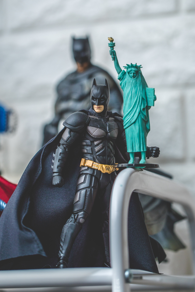 從下圖看,旁邊就是扭蛋大小的太自由女神,正後方是Play Arts改的BVS蝙蝠俠,一個才15公分大小的可動公仔竟然可以做到如此擬真的細節真的是很厲害。