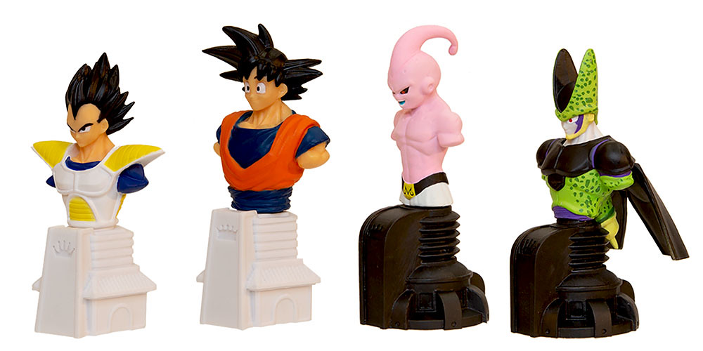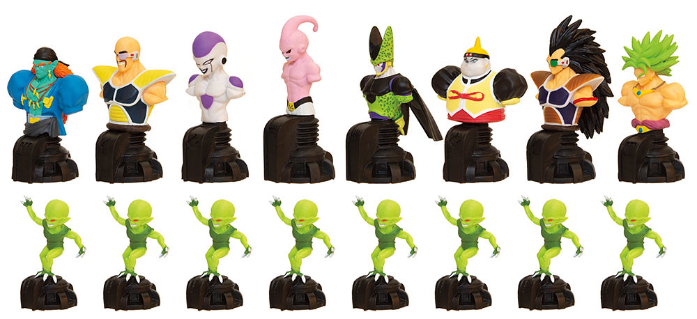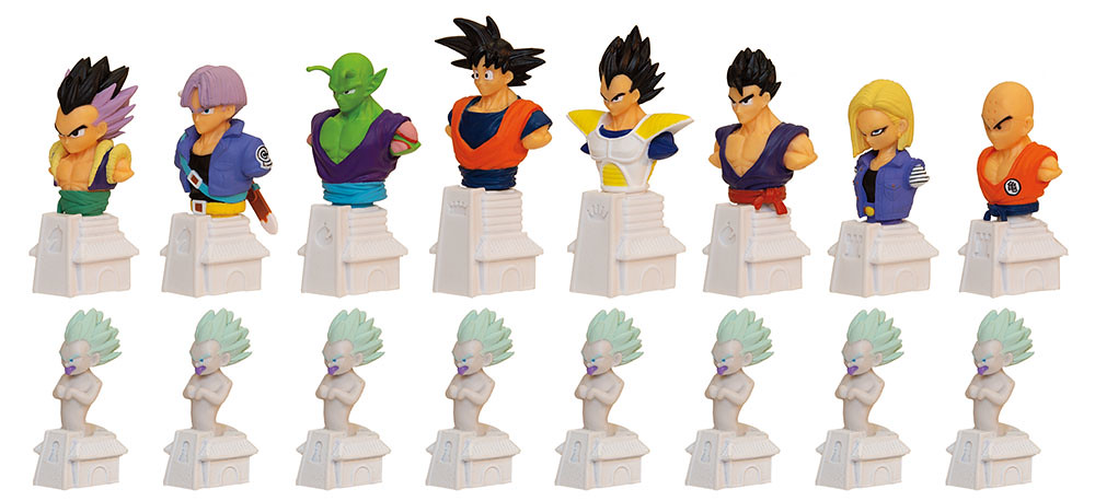 全彩塗裝的七龍珠角色西洋棋,以底座作為區分白棋與黑棋,白棋分別有:代表國王皇浩的悟空與達爾、代表主教的悟飯和比克,騎士是悟天克斯與未來特南克斯,人造人18號與克林為城堡,小兵則是可愛的幽靈悟天克斯。
