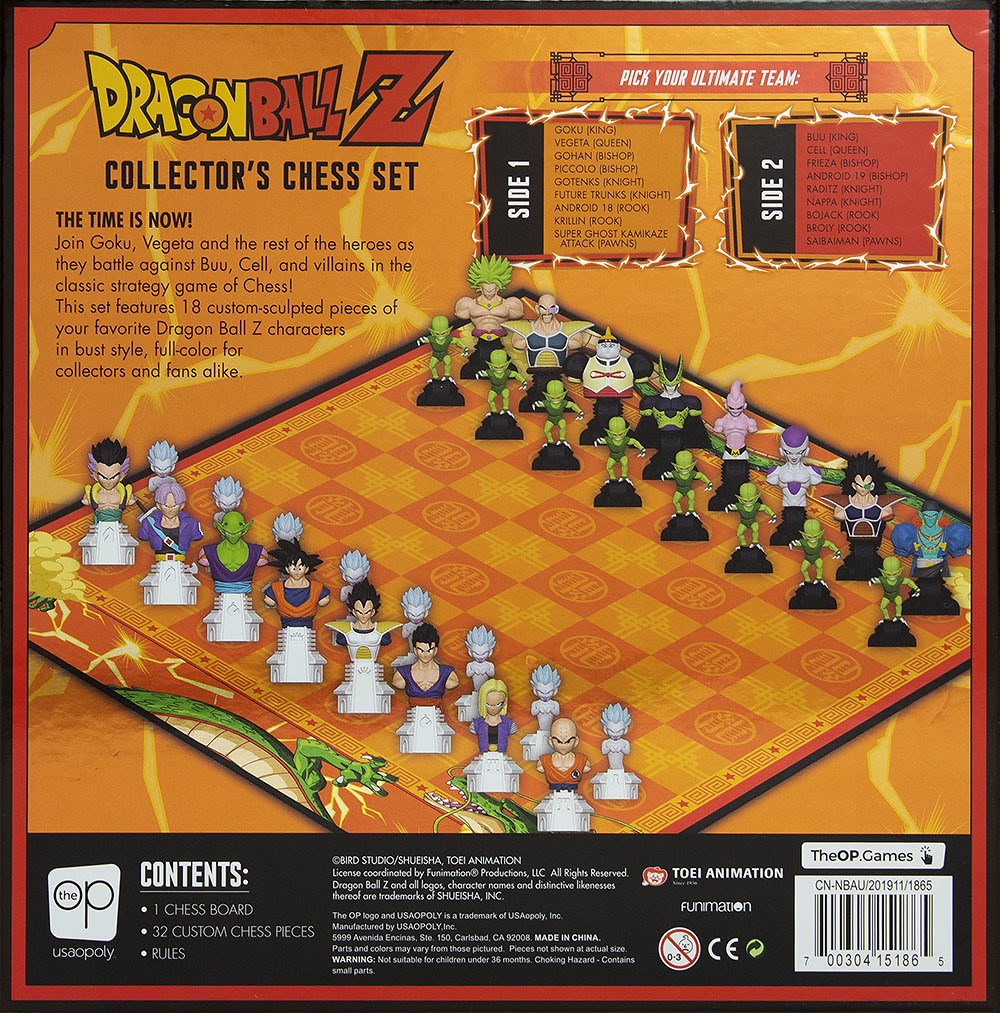 美國桌遊品牌 usaopoly 推出以全球超人氣動漫《七龍珠Z》為主題的「七龍珠Z西洋棋組」(Dragon Ball Z™ Collector’s Chess Set),以七龍珠角色們作為旗子造型,黑白棋雙方的角色分別是正義的主角群以及代表惡勢力的反派角色們,一次收藏 18 款角色!參考售價為 $59.99 美金,目前已在官網開放購買。
