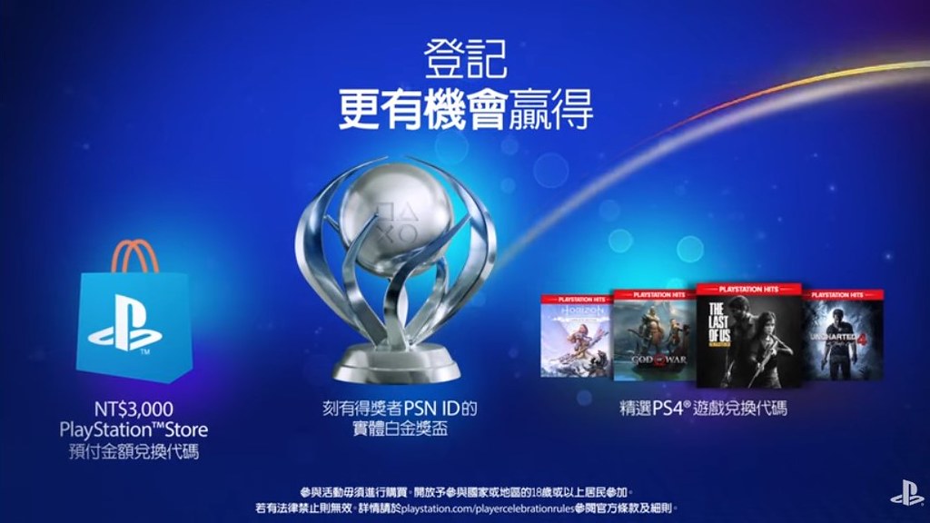 陣容包含:刻有得獎者PSN ID的實體白金獎盃、新臺幣$3,000 PlayStation Store 預付金額兌換代碼、精選PS4遊戲兌換代碼。