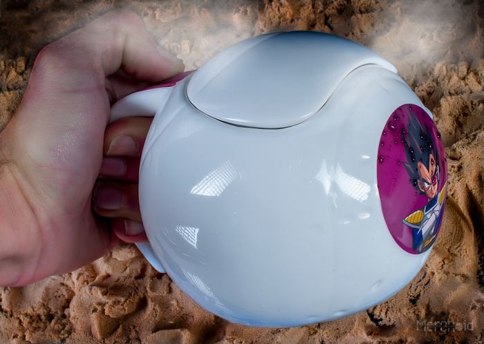 「賽亞人太空船造型 達爾/貝基塔 熱感應馬克杯」最大的特色在於船艙前方的視窗為特殊的熱感應塗裝,在杯中倒入熱水或是與手接觸後,即會浮現在太空船內的賽亞人王子-達爾/貝基塔圖樣!雙手交叉於胸前、穿著賽亞人戰鬥服,一臉自信滿滿的樣子,讓玩具人連喝飲料都可以充滿賽亞人的驕傲!