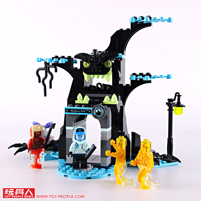 因為這次盒組數量較多,我們將用較為精簡的方式帶來每款盒組的重點以及與手機互動的過程,本篇將帶來場景類型的三款,首先讓我們從小盒組「LEGO 70427 Welcome to the Hidden Side」開始吧!這組主要是一棵鬼怪化的老樹模型,黑藍配色加重了陰森氛圍,不像其他款式的建築物有著「偽裝」,直接展現出一張清楚的鬼臉!眉間更用上一個骷髏人偶的身體點綴,強化造型感。