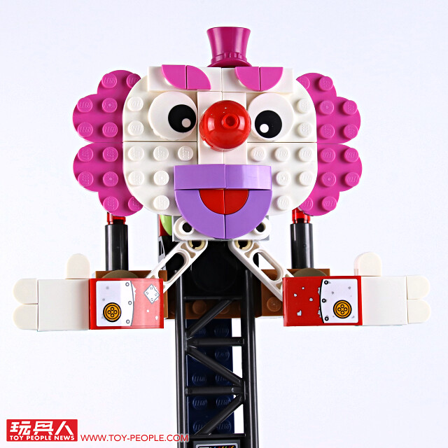▼ 先來看看最搶眼的小丑頭!除了招牌的大紅鼻子外,眉毛採用桃紅色的 1/4 圓零件並做出不對稱造型,臉部兩側各自用上了兩片愛心形狀零件。