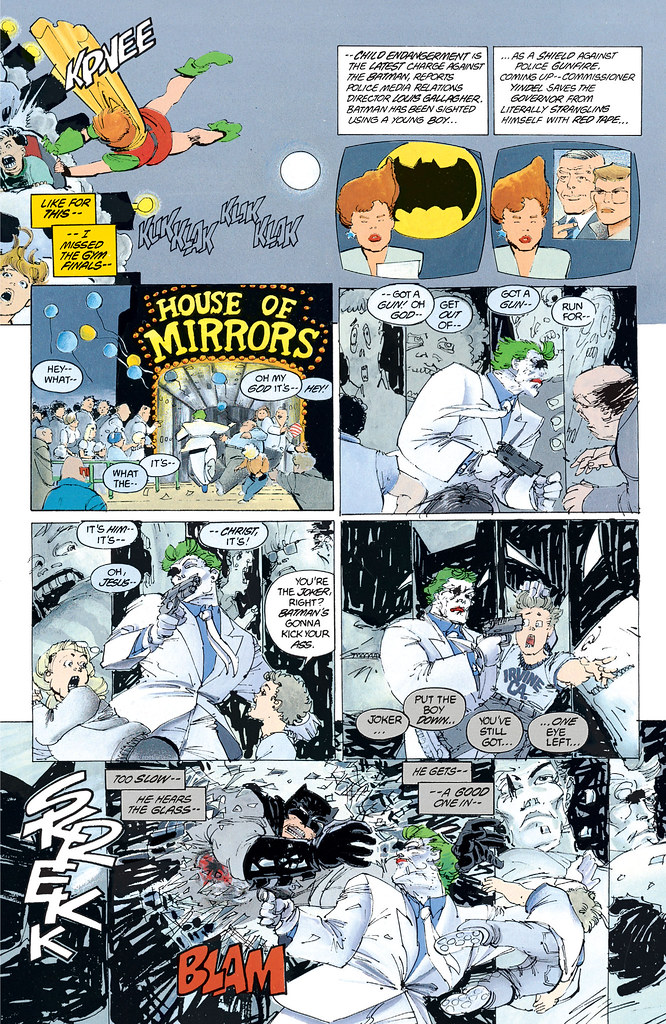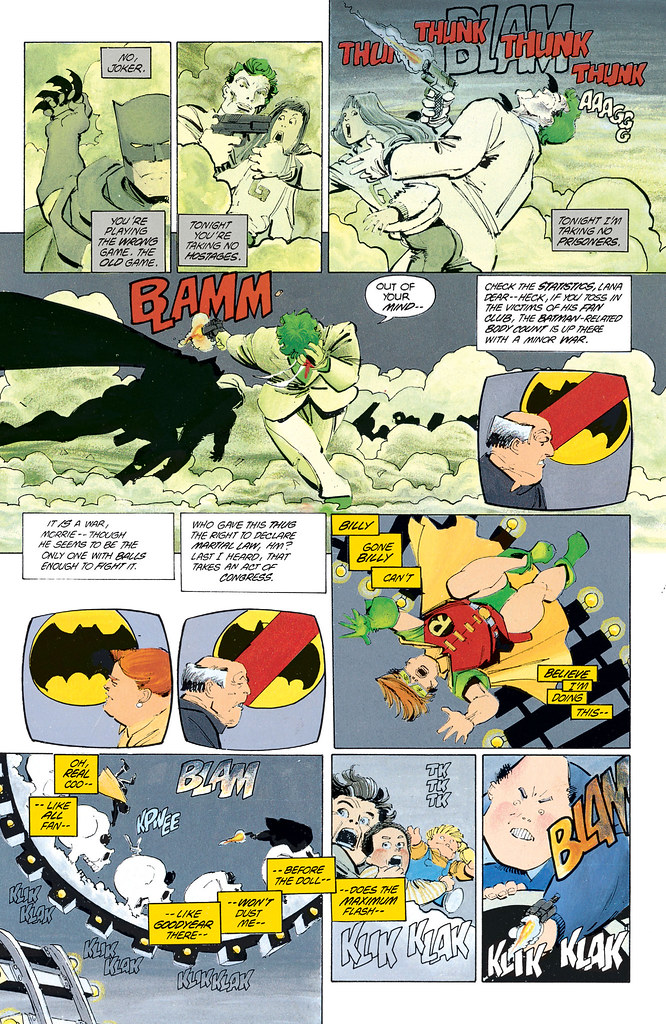 在《黑暗騎士歸來》故事中,小丑是蝙蝠俠面對的眾多反派之一,但他的瘋狂程度無疑令人留下最深刻的印象,不管是法蘭克·米勒(Frank Miller)所繪製的漫畫作品還是後來華納發行的動畫,小丑與蝙蝠俠在遊樂園中的追逐戰、肉搏死鬥都相當精彩!看著右眼已經被蝙蝠飛鏢射中的小丑仍肆無忌憚地狹持人質、殺人,還有用小刀狂捅蝙蝠俠,真的是讓人膽戰心驚。