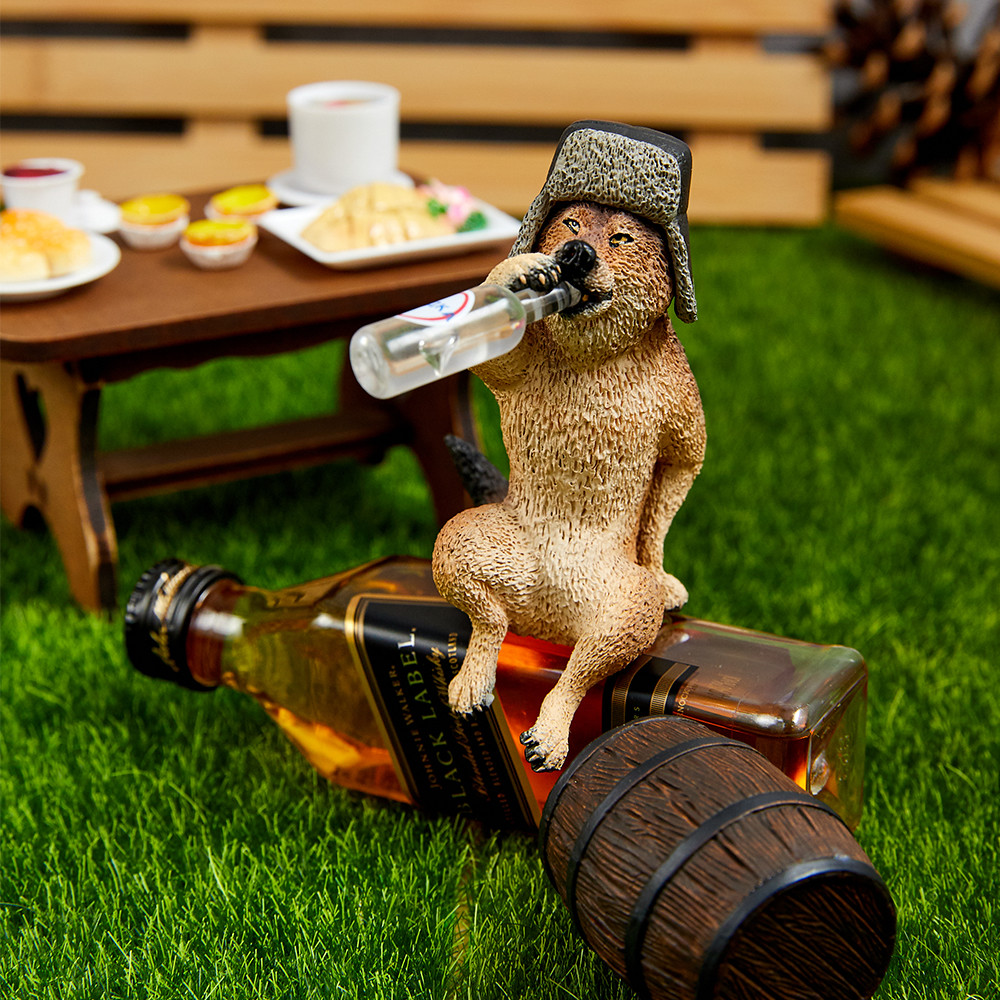戴雪地帽的狼平日在雪地狩獵也要為耳朵保暖,在寒冷的國家生活也要喝點烈酒抵抗寒冬!疑!!喝的酒是純正的伏特加啊!!看他豪邁的”採罐”(台語)就知道哥不是省油的燈,今天不來個好幾手是不會罷休的!