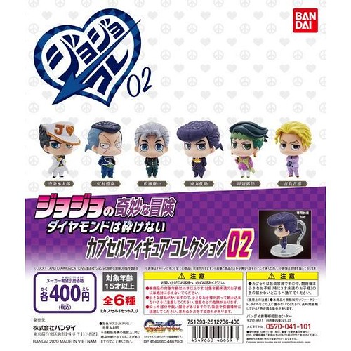 知名日本 BANDAI萬代玩具公司(株式会社バンダイ)旗下轉蛋事業部 GASHAPON 推出的《JoJo的奇妙冒險 》「角色人物收藏」系列,在去年( 2019 )推出第一彈《JoJo的奇妙冒險 第五部 黃金之風》後,再度推出第二彈續作《JOJO的奇妙冒險 不滅鑽石》角色人物收藏(ジョジョの奇妙な冒険 ダイヤモンドは砕けない カプセルフィギュアコレクション02)轉蛋,全六款,一轉參考售價為日幣 400 円,預計將於 2020 年 03 月下旬發售。