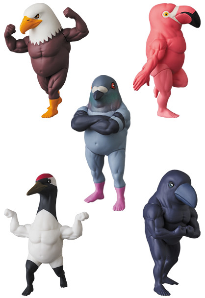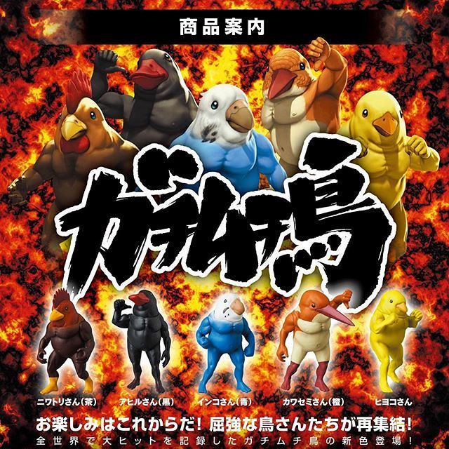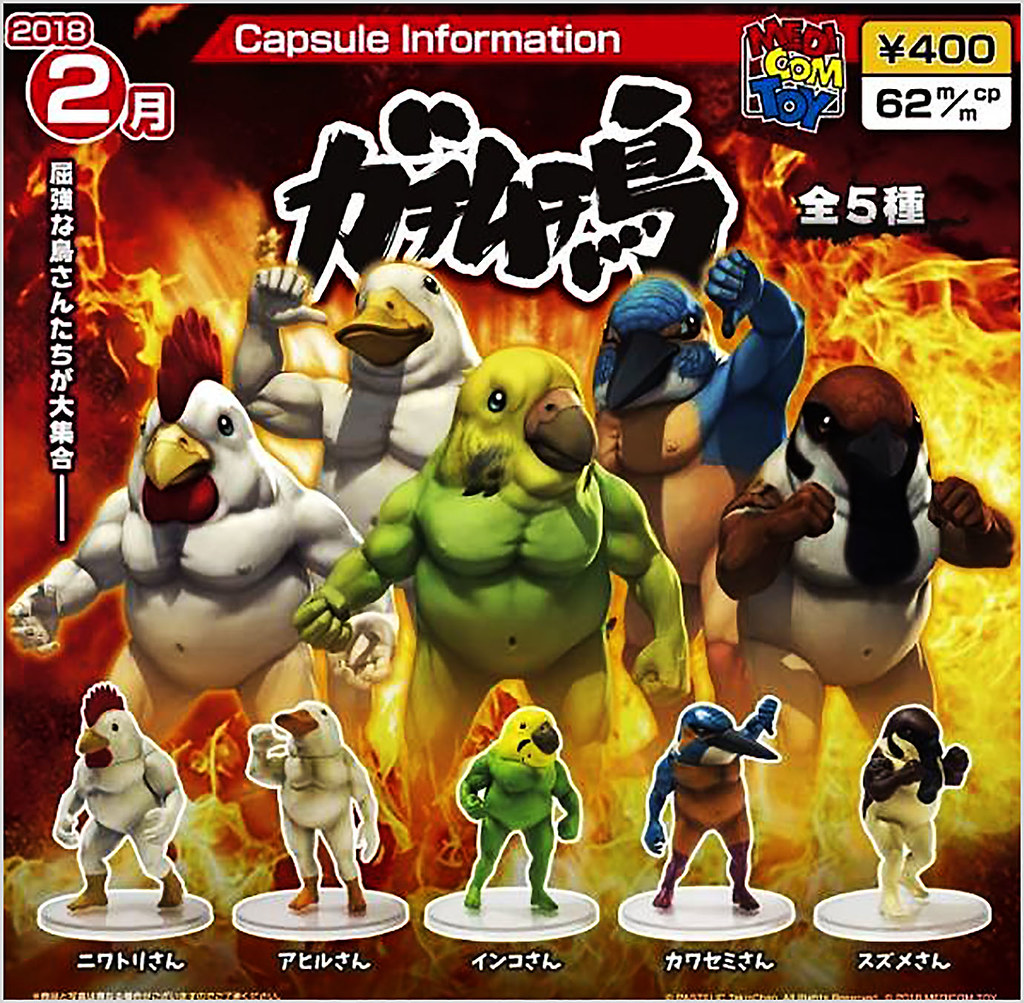 日本插畫家「TAKIO」(タキオ)所設計的「戰鬥筋肉鳥系列」(ガチムチ鳥シリーズ),將鳥禽與大肌肉的身材結合,變成體格壯碩的筋肉鳥!充滿挑釁的姿勢、或是展現肌肉的動作,都顯露出十分硬派的風格,令人不禁發笑而大受歡迎。