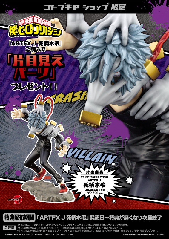 日本壽屋玩具公司(KOTOBUKIYA)旗下打造日本動漫、遊戲角色精緻立體作品的「ARTFX J」系列,在推出《我的英雄學院》人氣角色「綠谷出久」、「麗日御茶子」與「轟 焦凍」、「爆豪勝己」、「切島銳兒郎」等角色後,又發表了新作:「死柄木弔」1/8 比例模型。參考售價為日幣 9,800円,預計將於 2020年 08 月發售。