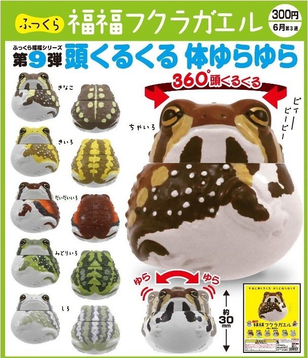 專門推出趣味轉蛋作品的奇譚俱樂部(株式会社奇譚クラブ)玩具公司,以可愛動物為主題的《豐滿福氣》(暫譯,ふっくら福福)系列,先前已出過「麻雀」、「招財貓」、「鸚鵡」以及「鯨頭鸛」等轉蛋作品,又將推出第 9 彈新作:「豐滿福氣短頭蛙」(ふっくら福福フクラガエル),一共六款,每轉300日幣,預計將於 2020年 06 月發售。
