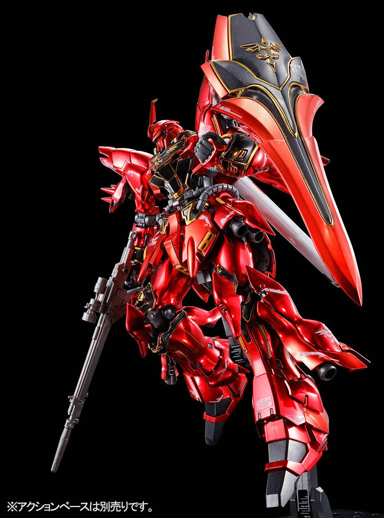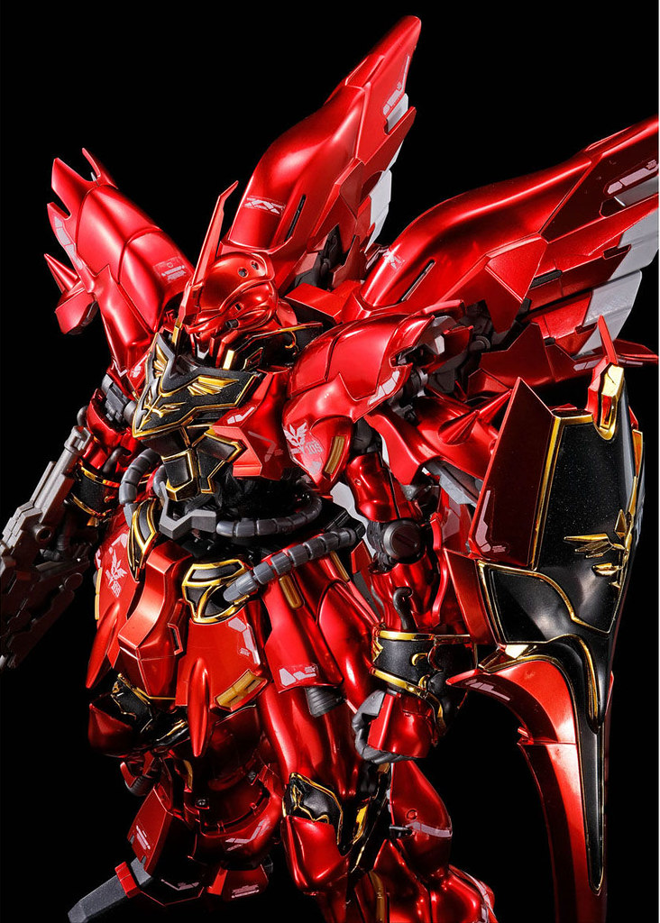 「RG 1/144 新安州[特殊鍍膜版]」以一般版套件為基礎,將成形色替換成更具金屬質感的特殊鍍膜版,全身特徵的紅色裝甲經過金屬紅、深紅兩種半消光電鍍處理呈現具備厚重感的沉穩光澤,。金色的紋章部份也和一般版相同採用電鍍金零件,不過骨架與黑色裝甲改為帶有金屬顆粒的成形色,更加襯托出豪華的金色光澤。而背包與燃料管的白色零件則使用 Titanium Finish 處理,帶有銀白色澤。不過 RG 新安州套件最讓人詬病的就是「腰軟」情況,除非你不 CARE 不然入手前請作好改造補強的準備。