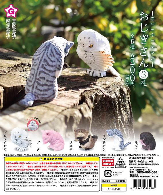 接續前作的風格,以禮貌彎下身子的擬人化動物為主題,「鞠躬動物 三禮」收錄了人氣可愛動物與令人眼睛一亮的罕見動物,分別有:眨眼的「雪鴞」、擠出三層肉的「粉紅豬」、「狸猫」、「鼴鼠」與「短腿貓」,一共五款。動物們低著頭有點像在打瞌睡的造型相當趣味,適合拿來和其他玩具作搭配擺放,也可以發揮創意用於生活之中~