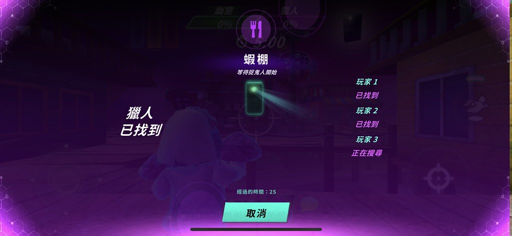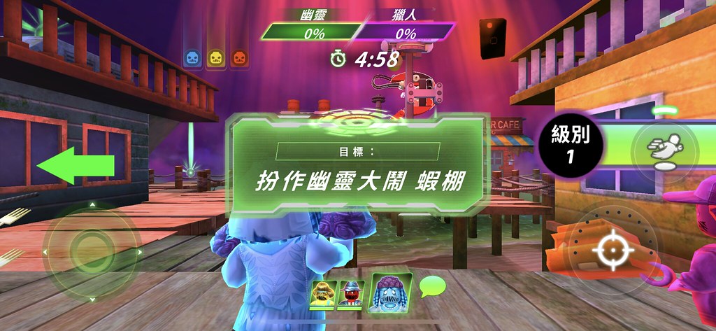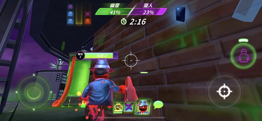 ▼ 遊戲開始!下圖為當鬼怪時的遊戲視角,我們必須一邊躲避獵人的追捕一邊讓場景裡的建築物「顯影」!要躲過獵人攻擊的方法包含:採用與獵人掃描顏色不同色的鬼、利用鬼的特殊能力(像是隱形、加速......等)、躲在牆壁裡(有時間限制)、藉著場景的遮蔽物躲起來......等。