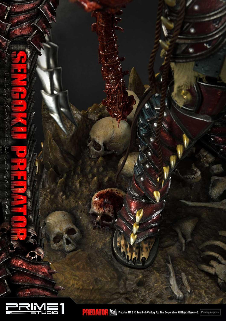 這次登場的「戰國終極戰士」是 Prime 1 Studio 根據黑馬漫畫的 Predator #1 限定變體版封面製作,讓宇宙中最強悍的狩獵者穿上古日本的武者鎧甲並做出異星風格的詮釋!本作高約 88.8 公分極具存在感,呈現出戰國終極戰士左手持握薙刀類型的武器、右手拿著頭部連脊椎的骨頭,血淋淋的樣貌極為恐怖,同時也展現出終極戰士的狩獵文化;在頭部除了有戴上頭盔的造型之外,也能將生化面罩取下露出威懾感十足的臉龐。