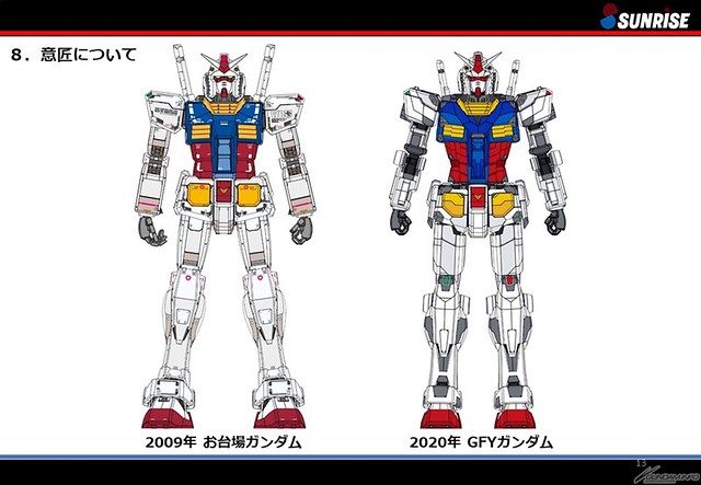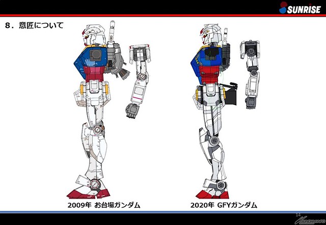 而鋼彈的裝甲造型也必須配合整體配重、移動方式進行調整,對比台場鋼彈相對還原設定的造型,橫濱鋼彈將頭部、背包小型化。同時也參考了富野由悠季導演提供的建議,視覺上體型更加修長、較近似近年來推出的新鋼彈。骨架各部基本上都能獨立作動,不過最終仍會依據「演出控制系統」統一操縱,將鋼彈最具魄力的移動場面呈現到觀眾眼前,讓人迫不及待 10 月的到來。