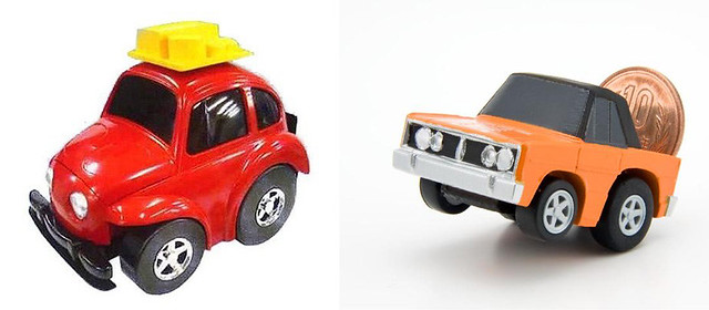 ▼圖左:昭和 55 年(1980 年)推出的第一款阿Q迴力車。圖右:車子尾端可以放一枚 10 圓日幣,加重後方重量,讓車子可以兩輪前進是阿Q迴力車的特殊玩法。(圖片來源:Middle edge)