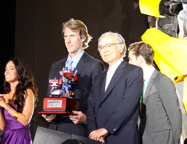 ▼2009 年上映的《變形金剛:復仇之戰》,佐藤安太受邀出席該片的世界首映會,在活動上佐藤安太向導演麥可貝(Michael Bay)表示感謝,能將 25 年前誕生的機器人玩具,拍攝成如此精湛的電影。並贈送給麥可貝特製的變形金剛獎座。(圖片來源:Game Watch)