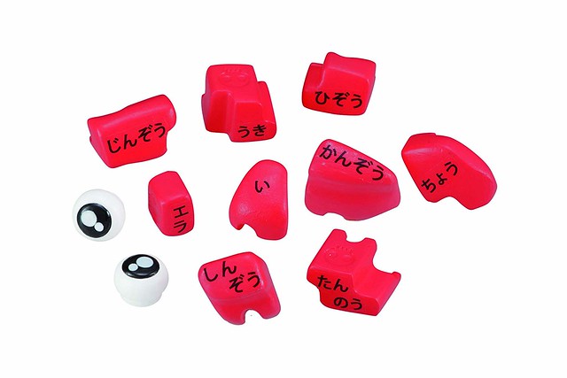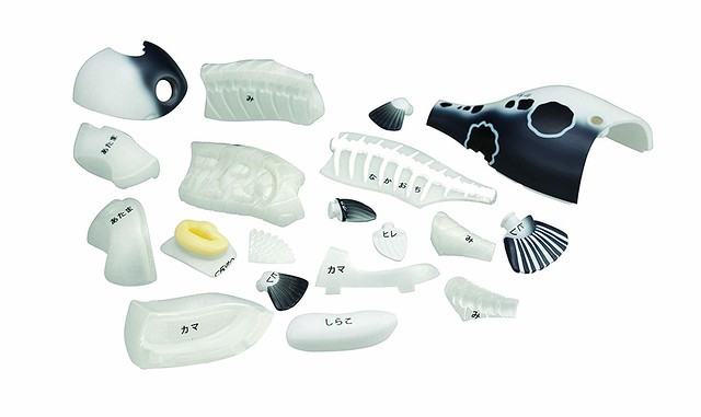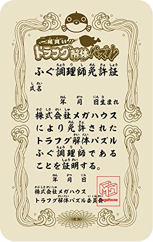 「買一整尾!!虎河豚解體拼圖」共由 34 塊零件組成,能將一整隻虎河豚從皮、肉、內臟、骨頭逐步解體,在含有毒素不可食用的部位更會標記顯眼的「骷髏頭」圖樣,讓你學習到吃下哪些東西是有生命危險的,習得知識後商品中還附上一張「虎河豚解體拼圖料理證照」給你,相當可愛!此外還有展示台座、魚刀、生魚片盤子等零件。