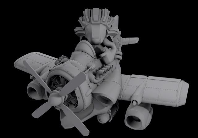 一開始使用3D MAX進行飛機設計,把二戰飛機P-40/P-51的結構稍作了解後進行變形,並誇張一些管線與引擎結構。