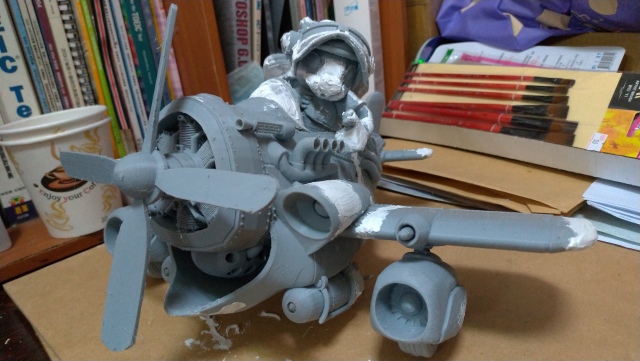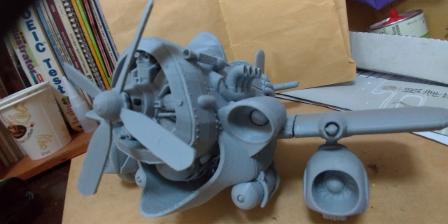 魚雷機翅膀、本體、輪軸與螺旋槳等部位分件切開,減少支架出現在表面時的修補問題。因為本體在數位檔時有在身上增加鉚釘的效果,過多補土會引想打磨蝕的方便性。