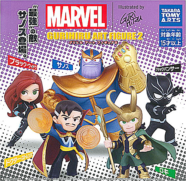 由 TAKARA TOMY ARTS 推出的這款 MARVEL 人物轉蛋,為 Gurihiru 經手重新繪製的系列第2彈,收錄了五位大家熟知的角色:奇異博士史傳奇、黑豹、黑寡婦、洛基,以及大頭目薩諾斯。每一位角色都經由兩位漫畫家的巧思,有著截然不同的面貌,看起來相當可愛又有趣,喜歡這系列的朋友非常值得收藏喔!