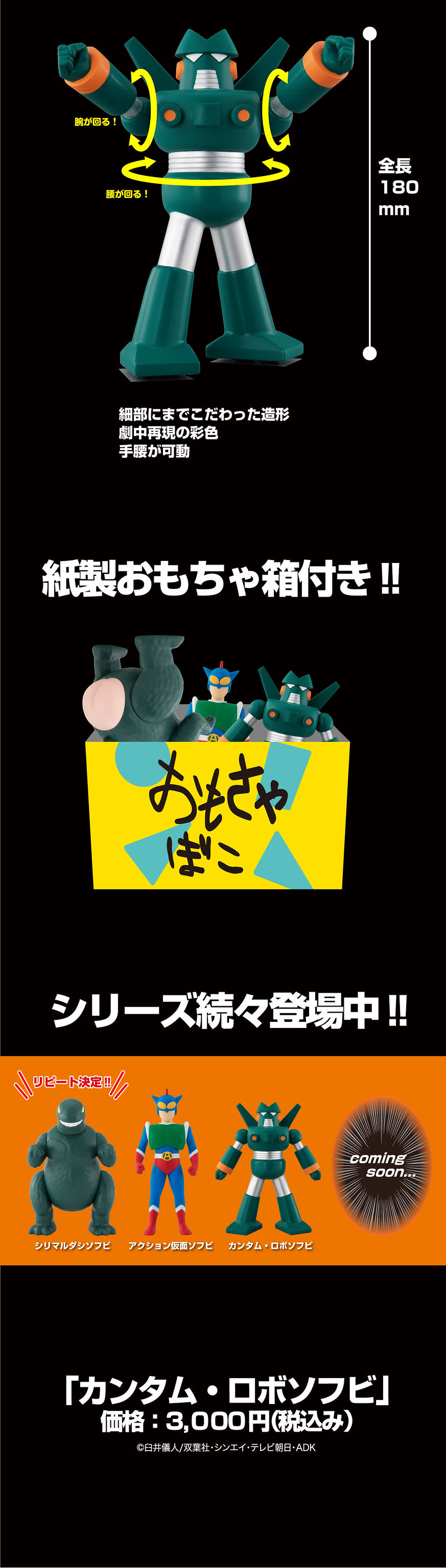 知名日本 Bandai 萬代玩具公司之前以人氣動漫《蠟筆小新》為主題推出極具人氣好評的「光屁屁怪獸」與「動感超人」,承接著系列將小新玩具立體化的風格,接下來要推出的新作為「康達姆機器人」(暫譯,カンタム・ロボソフビ)PVC 可動軟膠,參考售價為 3,000 日圓,目前已開放在日本 Premium Bandai 網站預購,預計將於 2020 年 08月發售。
