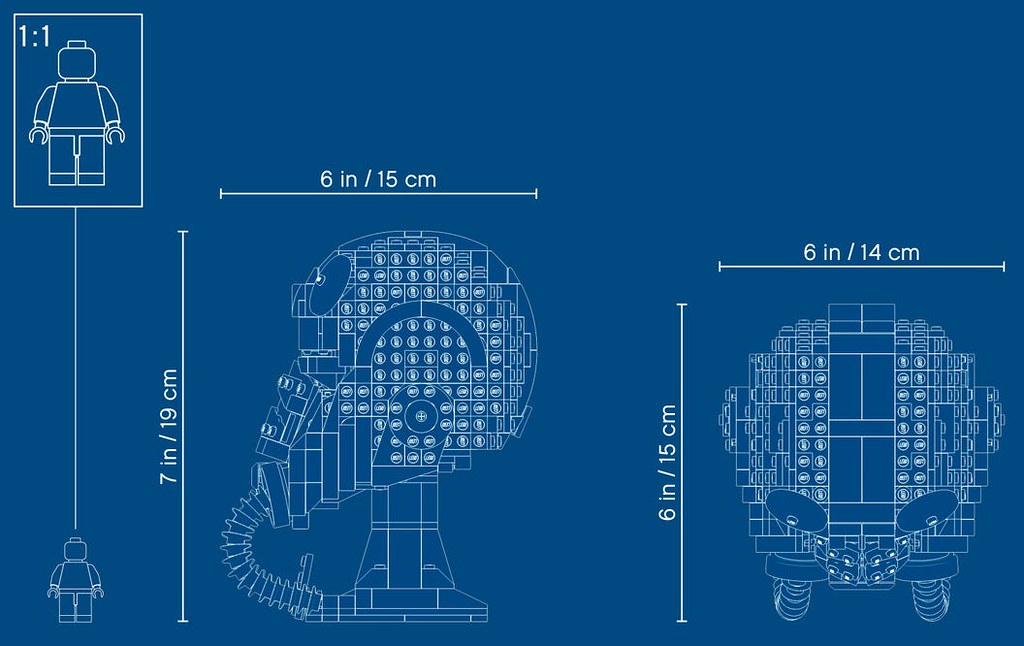 「LEGO 75274 鈦戰機駕駛員頭盔」零件數是這次三個頭盔之中最多的 724 片,組裝完成之後高約 19 公分,表面運用大量的黑色零件、弧面磚、斜面磚勾勒出外型,銀河帝國(Empire)標誌的印刷件相當搶眼、帥氣,頭盔側邊與嘴部也高度還原,原本連到胸口呼吸器的兩根管子這裡是設計成與展示底座相連,雖然整體基本上都是黑色,但豐富的細節與多樣的零件選用讓本作富含層次,展示起來真的很帥!
